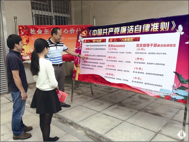 為增強(qiáng)學(xué)習(xí)貫徹的自覺(jué)性、主動(dòng)性,把學(xué)習(xí)貫徹與具體工作實(shí)際結(jié)合起來(lái),公司紀(jì)檢監(jiān)察室在第一時(shí)間進(jìn)行宣傳貫徹。一是以短信形式,向公司全體黨員和中層以上干部發(fā)送2期《廉政知識(shí)學(xué)習(xí)卡》短信,并就“妄議中央”、“老鄉(xiāng)會(huì)、校友會(huì)、戰(zhàn)友會(huì)”、“四類(lèi)人員不得買(mǎi)賣(mài)股票”、“社會(huì)主義核心價(jià)值觀”等內(nèi)容分4次發(fā)送短信進(jìn)行解讀,以最快捷的方式、最簡(jiǎn)潔的字句讓黨員干部及時(shí)了解和知曉《準(zhǔn)則》和《條例》的關(guān)鍵內(nèi)容;二是組織黨委中心組成員集中專(zhuān)題學(xué)習(xí);三是制作四版《準(zhǔn)則》和《條例》宣傳版報(bào),分別布置于二樓、三樓辦公走廊;四是為全體黨員訂購(gòu)人手一份《中國(guó)共產(chǎn)黨廉潔自律準(zhǔn)則、中國(guó)共產(chǎn)黨紀(jì)律處分條例、中國(guó)共產(chǎn)黨章程》單行本,全部發(fā)放到每一位黨員手中,要求原原本本、逐字逐句認(rèn)真學(xué)習(xí);五是在公司OA信息系統(tǒng)黨務(wù)紀(jì)工團(tuán)門(mén)戶(hù)發(fā)布通知學(xué)習(xí)。