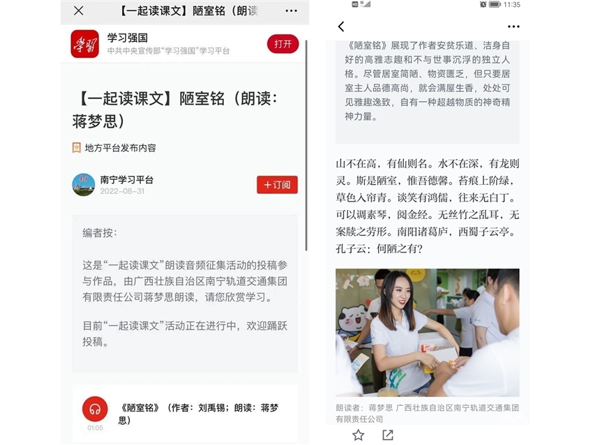 軌道地產(chǎn)商業(yè)公司黨支部蔣夢思同志參加了此次活動,她朗讀的作品《陋室銘》經(jīng)南寧軌道交通集團推選,榮登“學(xué)習(xí)強國”平臺,在“一起讀課文”欄目展播。