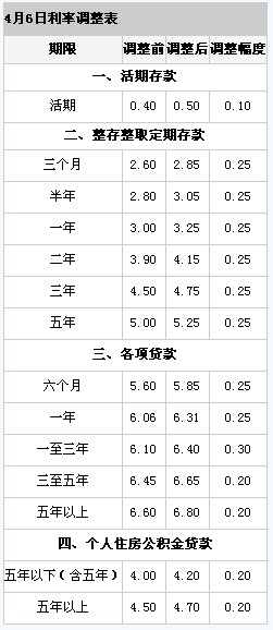 中國(guó)人民銀行決定,自2011年4月6日起上調(diào)金融機(jī)構(gòu)人民幣存貸款基準(zhǔn)利率。金融機(jī)構(gòu)一年期存貸款基準(zhǔn)利率分別上調(diào)0.25個(gè)百分點(diǎn),其他各檔次存貸款基準(zhǔn)利率及個(gè)人住房公積金貸款利率相應(yīng)調(diào)整(見附表)。
